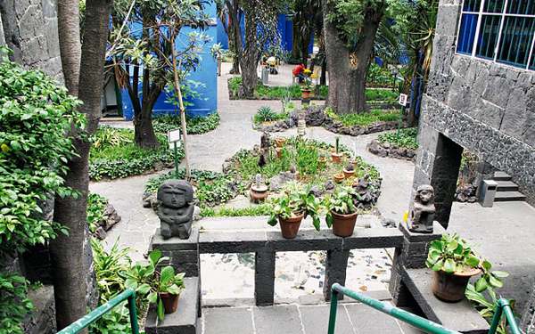 La passione per il giardinaggio di Frida era un tutt’uno con la sua arte e con il mito nazionalista di cui si fece strenua portatrice fin nella scelta degli abiti, sempre e rigorosamente precolombiani, e degli animali domestici, scimmie, pappagalli, tacchini, un’aquila e un branco di cani messicani. Anche alcune delle piante non native del suo giardino erano intrise di storia: le calle erano approdate in Messico con gli schiavi dall’Africa, mentre i crisantemi cinesi erano arrivati a bordo dei galeoni spagnoli. Quello che suo marito, il famoso muralista Diego Rivera, disegnava pubblicamente e su scala mondiale, Frida lo coltivava nel privato della loro casa. Nella riedizione newyorkese del suo orto c’è pure una riproduzione in miniatura della piramide azteca fatta ergere da Rivera, che la usava per esporre i suoi pezzi preferiti della loro collezione di arte precolombiana.