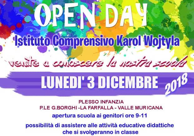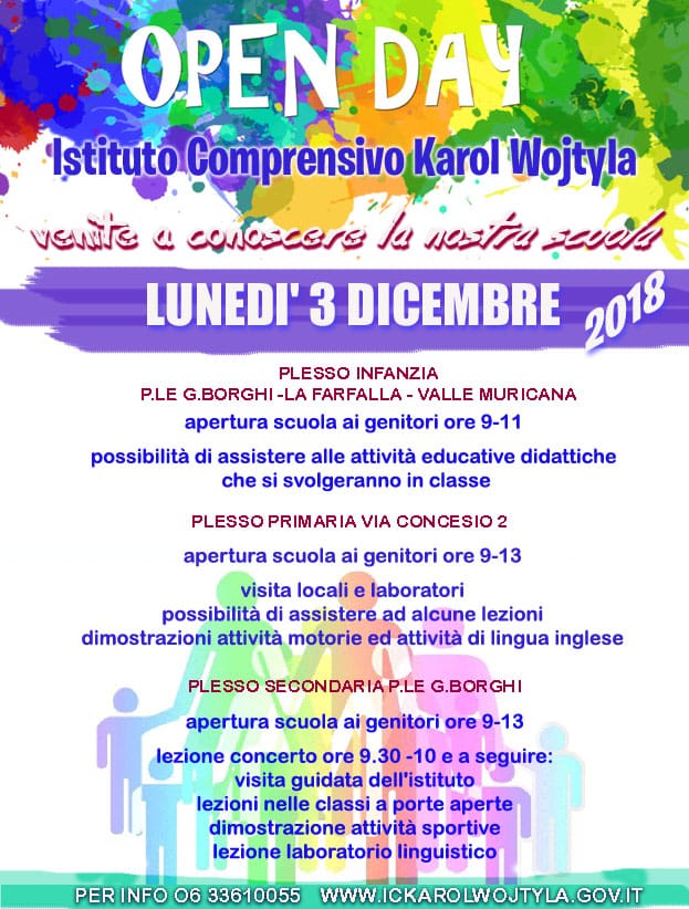 Roma- Genitori invitati anche quest’anno a conoscere la scuola dei figli nella giornata a porte aperte dell’Istituto Comprensivo Karol Wojtyla: lunedì 3 dicembre dalle 9 alle 13 potranno assistere alle attività educative- didattiche che si svolgeranno in classe, a dimostrazioni di attività sportive, a lezioni nei laboratori di linguistica e potranno visitare locali e laboratori dove i loro ragazzi trascorrono le loro giornate scolastiche.