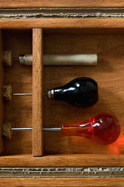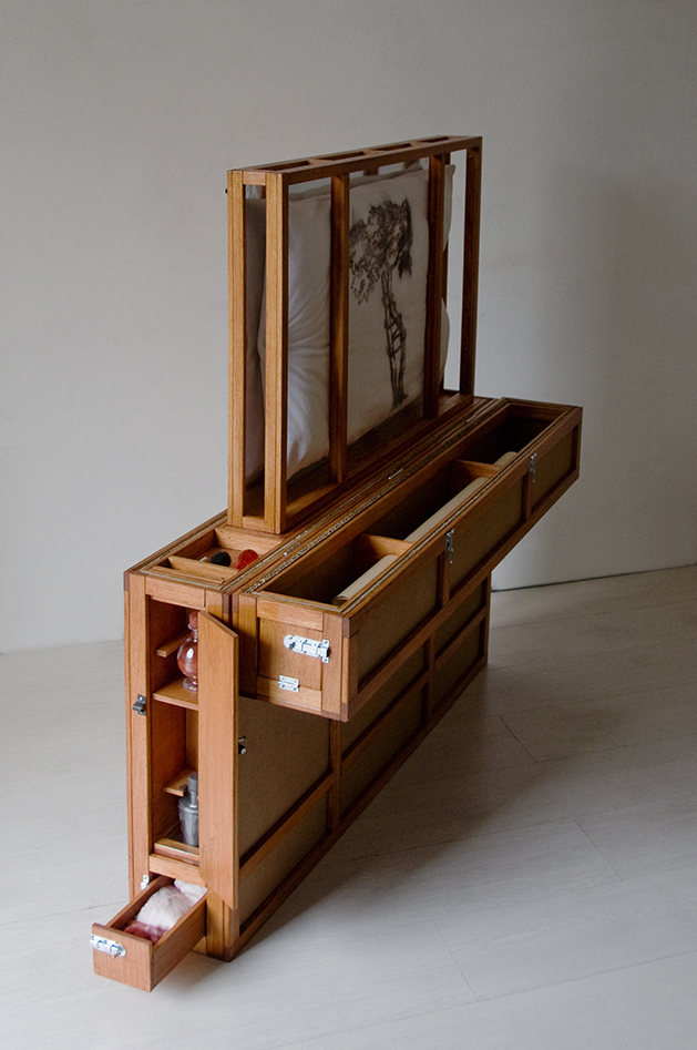 Inside, è un’ installazione site specific di sculture, che occupa le sale al piano inferiore della galleria, che come scrigni hanno la possibilità di aprirsi e chiudersi ed il cui contenuto verrà svelato prendendo individualmente appuntamento con l’artista in giorni prestabiliti. Punto di partenza della mostra è la rappresentazione di un sogno in cui la rigorosa struttura di un letto, una pietra di fiume, un bigliettino di cui è impossibile leggerne il contenuto, dell’acqua in contenitori di vetro e tre pesci rossi danno forma al fragile equilibrio delle scultura “Benché nessuno degli elementi che compongono l’opera appartenga propriamente alla dimensione marina tutto sembra condurvici”. Mare come metafora di qualcosa che infinitamente ci supera, come la paura primordiale dell’ignoto, come luogo generatore di sogni inquieti ma meravigliosi.