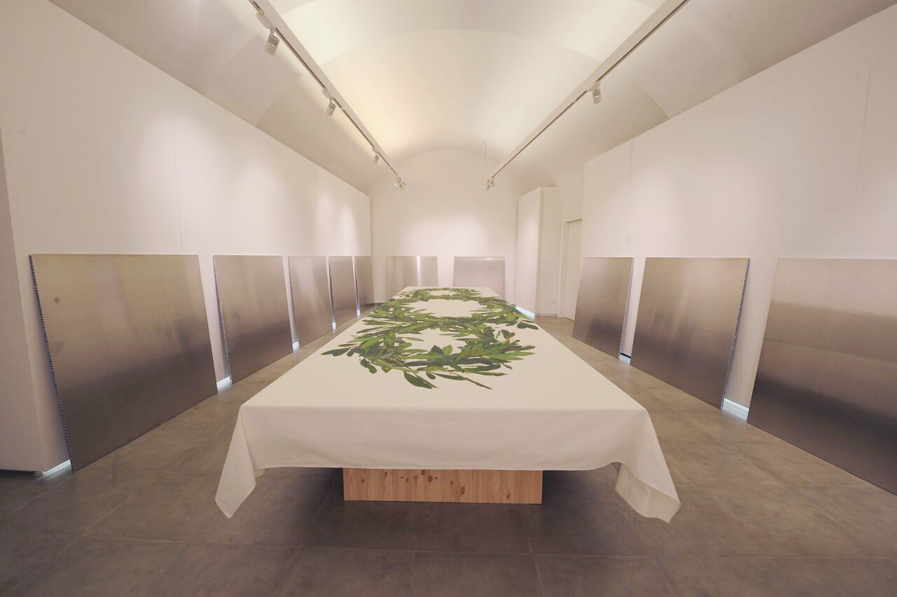 L’ultima opera di Michelangelo Pistoletto: Il Terzo Paradiso ha come simbolo l’infinito ed è formato da una linea che intersecandosi due volte disegna tre cerchi allineati. I due cerchi opposti significano natura e artificio, quello centrale è la congiunzione dei due. Pistoletto ha sentito la necessità di risvegliare le coscienze, affinché il Terzo Paradiso superi la valenza simbolica e si faccia realtà. L’11 giugno 2015 nelle sale della Galleria, Michelangelo Pistoletto ha fatto realizzare un grande tavolo rivestito da una tovaglia appositamente creata con il simbolo del Terzo Paradiso, intorno al quale sono state riunite ventiquattro persone disposte a dibattere, a condividere questo tema: giovani amanti dell’arte e grandi collezionisti, tra cui Ottavia e Emiliano Cerasi, Clara e Giovanni Floridi, Giulia e Massimiliano Mucciaccia, Dora e Mario Pieroni, Armando Pasini, Imelda e Reza Safavi, chiamati a discutere sul ruolo dell’arte, della bellezza, della storia e dell’educazione. Appoggiati alle pareti 12 grandi specchi, rivolti verso il muro. La conversazione scaturita da quell’incontro ha coinvolto tutti i presenti i quali, come segno della propria partecipazione, alla fine della serata hanno scritto un pensiero sul retro dello specchio, diventando in tal modo sia il soggetto che il testimone dell’evento. La mostra segna l’ideale conclusione dell’evento iniziato cinque mesi fa.