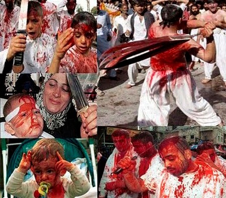 Il versamento di sangue per l’annuale rito del lutto (Musulmani) Con questa pratica i musulmani (clicca sulla foto per continuare a leggere)Il versamento di sangue per l’annuale rito del lutto (Musulmani) Con questa pratica i musulmani sciiti ricordano la morte dell’ Imam Hussein, il nipote del profeta Maometto, nella battaglia di Kerbala avvenuta nel settimo secolo d.C. I padri colpiscono in testa con le spade la testa dei loro figli. Il sangue che viene versato sulle strada è una forma di cordoglio per non essere stati presenti sul campo di battaglia ed aver combattuto al fianco di Husayn. Gli sciiti ritengono che questa pratica li assolva dai loro peccati.