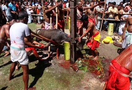 Massacrare gli animali (India, Indonesia e Nepal) Nell’Induismo si strangolano (clicca nella foto per continuare a leggere)Massacrare gli animali (India, Indonesia e Nepal) Nell’Induismo si strangolano e si uccidono gli animali con una punta di legno che gli trapassa il cuore. La pratica si effettua per onorare un dio induista e rendere innocui gli spiriti maligni.