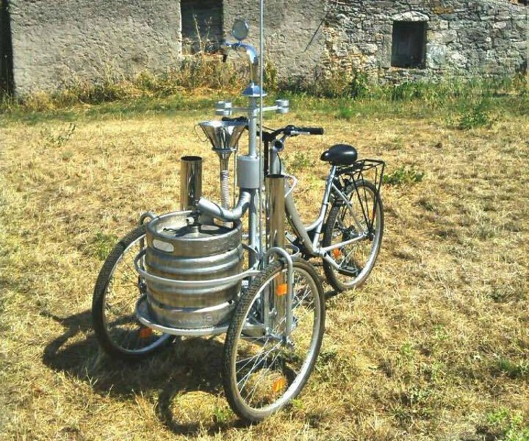 “che fa uscire la birra da un erogatore che si trova davanti al manubrio. Qui c’è sistemata tutta al parte dedicata al fruitore che potrà prendere da solo o un bicchiere da 0,2 L oppure uno da 0,4 L, sistemarlo su un apposito adattatore, e controllando con le pedalate l’erogazione della birra riempirsi il bicchiere. In più si è deciso di legare questa azione ad un elemento ludico: su questo primo prototipo si è posto sul terminale di un’asta metallica una ruota ad otto raggi di metallo che, quando la birra viene erogata, gira e fa girare una serie di nastri colorati ad essa sospesi. In tal modo è visibile da lontano il momento in cui la birra si sta versando e comunque si lega il gesto di versare birra ad un gioco che ci lega all’infanzia”.