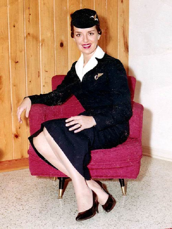 “In quegli anni le hostess non potevano sposarsi o avere figli, dovevano seguire una dieta severa e abbandonare il servizio a bordo a 32 anni. Ma le regole sono cambiate, anche nell’abbigliamento: se all’inizio indossava guanti bianchi, pelliccia e cappellino blu, negli Anni ’70 ha lavorato con stivali alti, hot pants e una camicetta bianca aderente (…)”.