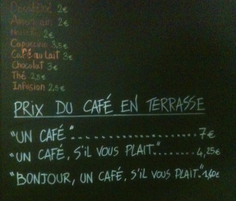 NIZZA – La Petite Syrah, un bar di Nizza, ha implementato un listino prezzi molto originale per far in modo che i clienti non perdano mai le buone maniere. Infatti, un caffè semplice (come dimostra la foto) costa 7 euro ma se durante l’ordinazione ci si ricorda di dire “per favore” allora il prezzo diventa più accessibile, 4 euro e 25 centesimi. Se volete però che il prezzo si abbassi ulteriormente e tenervi buono il barista dire “Buongiorno, un caffè per favore” vi costerà solo un euro e quaranta.