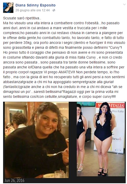 “La vita le mostra una nuova opportunità. Scusate sarò ripetitiva.. Ma ho vissuto una vita intera a combattere contro l’obesità…ho passato anni duri..anni in cui andavo a mare vestita e truccata per i mille complessi,ho passato anni in cui restavo chiusa in camera a piangere per le offese della gente,ho combattuto tanto, ho lavorato tanto, e fatto di tutto per perdere 35kg, ora porto ancora i segni (dentro e fuori)per il mio vissuto sono grassottella e piena di difetti ma finalmente posso definirmi “Curvy”! Ho preso tutto il coraggio che pensavo di non avere e mi sono presentata in costume sfilando davanti alla giuria di miss Italia Curvy , e non ci credo ancora sono passata , sono passata tra tante donne bellissime, sono passata anche io!Diana quella che ha passato una vita intera a soffrire per il proprio corpo! Il messaggio di Diana: “Vi prego, amatevi!””