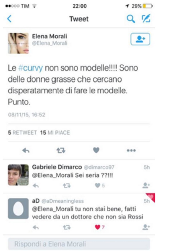 ROMA – “Le #curvy non sono modelle!!!! Sono delle donne grasse che cercano disperatamente di fare le modelle. Punto”. Tra un tweet di sostegno a Valentino Rossi con foto del lato B in primo piano e l’altro, Elena Morali, ex pupa ed ex fidanzata di Renzo Bossi e di Jorge Lorenzo, ha lanciato una provocazione che ha subito scatenato la reazione sui social.