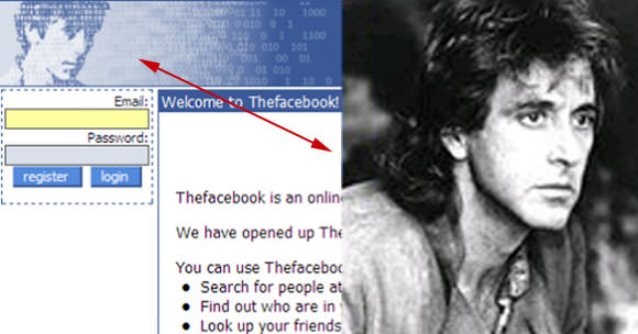- 1 – La prima faccia comparsa su Facebook è stata quella di Al Pacino . È stato il protagonista di una delle prime home page di Facebook. Vi ricordate quel viso stilizzato, di colore blu? Ebbene, si tratta di un ritratto di un giovanissimo Al Pacino, disegnato da Andrew McCollum, amico e compagno di corso di Mark Zuckerberg. Perché proprio Al Pacino? Nessuno parrebbe saperlo, nemmeno Zuckerberg.