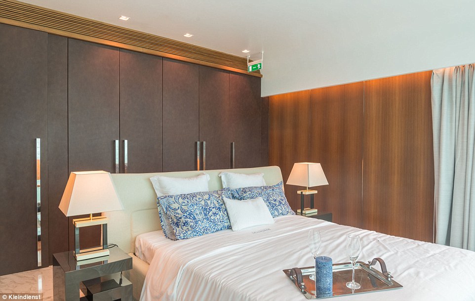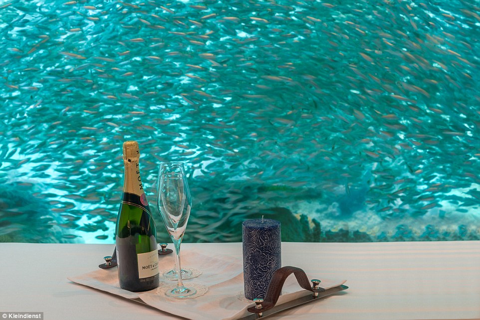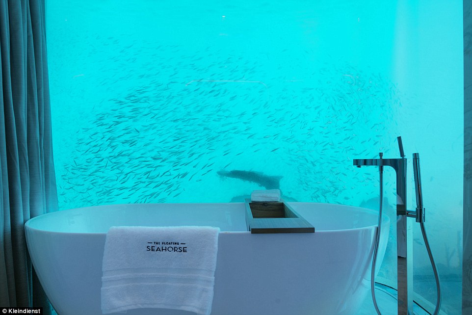 Nella parte subacquea, la villa ha una camera matrimoniale e un bagno, con una vasca freestanding (ossia al centro della stanza n.d.r), specchi riscaldati, e una camera matrimoniale con bagno. L parte sopra il livello del mare è munita di soggiorno, sala da pranzo, cucina completamente attrezzata e bagno, oltre a un ponte esterno per prendere il sole e una scala per salire e scendere dal mare dopo un bel bagno.
