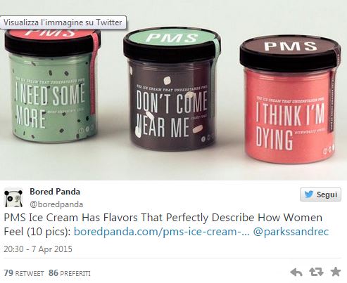 OKLAHOMA (USA) – Gelato per alleviare malumore premestruale: creata una marca ad hoc. L’idea è di Parker Jones, una 21enne americana, che ha prodotto una “linea” di gelati che riportano sul barattolo alcune frasi tipiche pronunciate dalle donne nei giorni precenti l’arrivo del ciclo. Al momento ce ne sono tre: