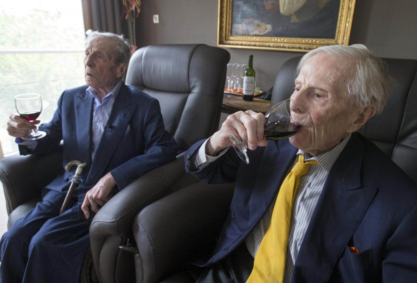 A 102 anni, sono la coppia di gemelli più longeva del mondo. A tutti quelli che vorrebbero sapere il loro segreto per arrivare a quest’età nelle loro condizioni i due hanno risposto spiegando che il segreto è semplice: “Il nostro elisir di lunga vita – assicurano i due fratelli ultracentenari – è bere un bicchiere di vino al giorno” (foto LaPresse).