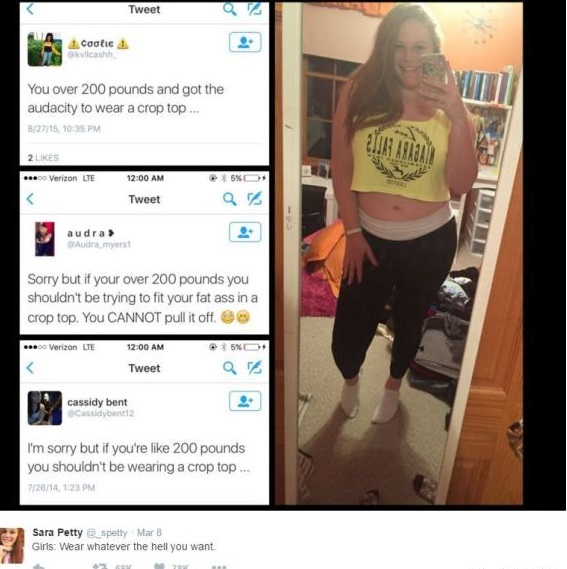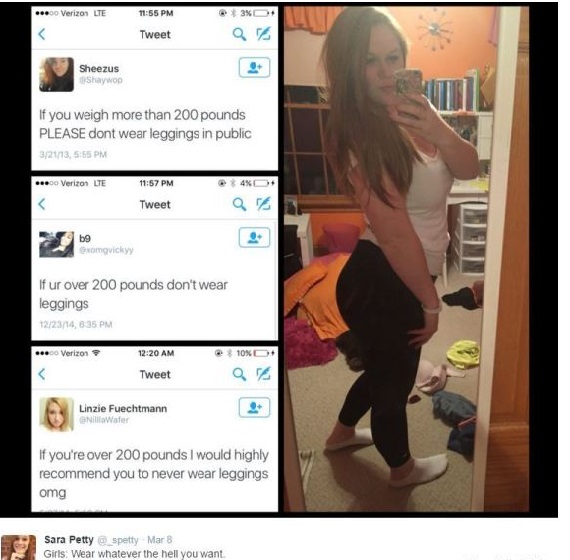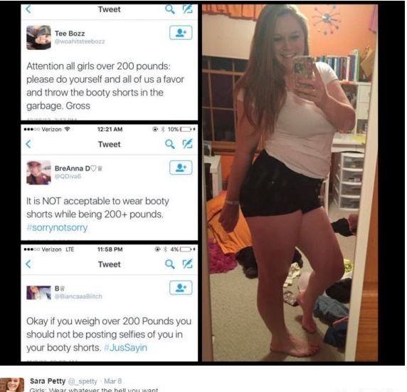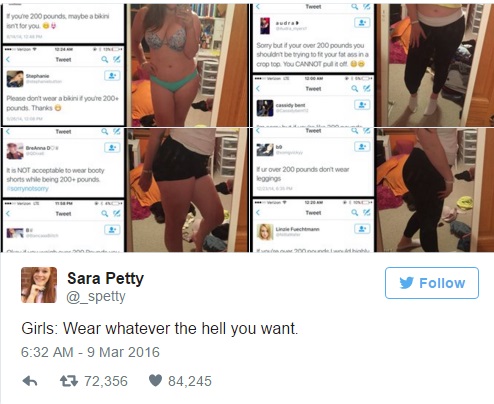 Nelle quattro immagini scelte, Sara Petty, studentessa di 20 anni della Bowling Gree State University di Sunbury nell’Ohio, ha utilizzato immagini di sé stessa per mettere in discussione i canoni di bellezza imposti dalla società. Per tutte le immagini, Sara ha pubblicato la stessa didascalia: “Ragazze: indossate quel diavolo che volete”.