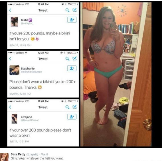 All’Huffington Post Usa ha poi spiegato: “Alcuni scrivono che donne oltre un certo peso non possono indossare bikini, ad esempio. C’erano molti tweet di questo genere, così ho deciso di fare la mia parte e di ribaltare questa visione del mondo”. Il messaggio da lei pubblicato, è nato con lo scopo di mettere a tacere chi crede che solo un corpo magro possa essere bello e piacente.