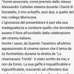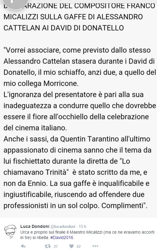 “Vorrei associare – prosegue Micalizzi – come previsto dallo stesso Alessandro Cattelan durante i David di Donatello, il mio schiaffo, anzi due, a quello del mio collega Morricone. L’ignoranza del presentatore è pari alla sua inadeguatezza a condurre quello che dovrebbe essere il fiore all’occhiello della celebrazione del cinema italiano”.