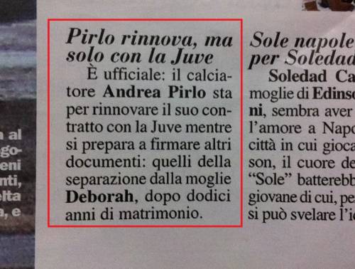 Insomma, se da una parte la carriera di Pirlo va a gonfie vele (il calciatore ha appena rinnovato il contratto con la Juventus e continua ad essere definito il “regista” della squadra allenata da Antonio Conte) secondo alcuni rumors sembrerebbe che la vita privata stia subendo qualche contraccolpo.