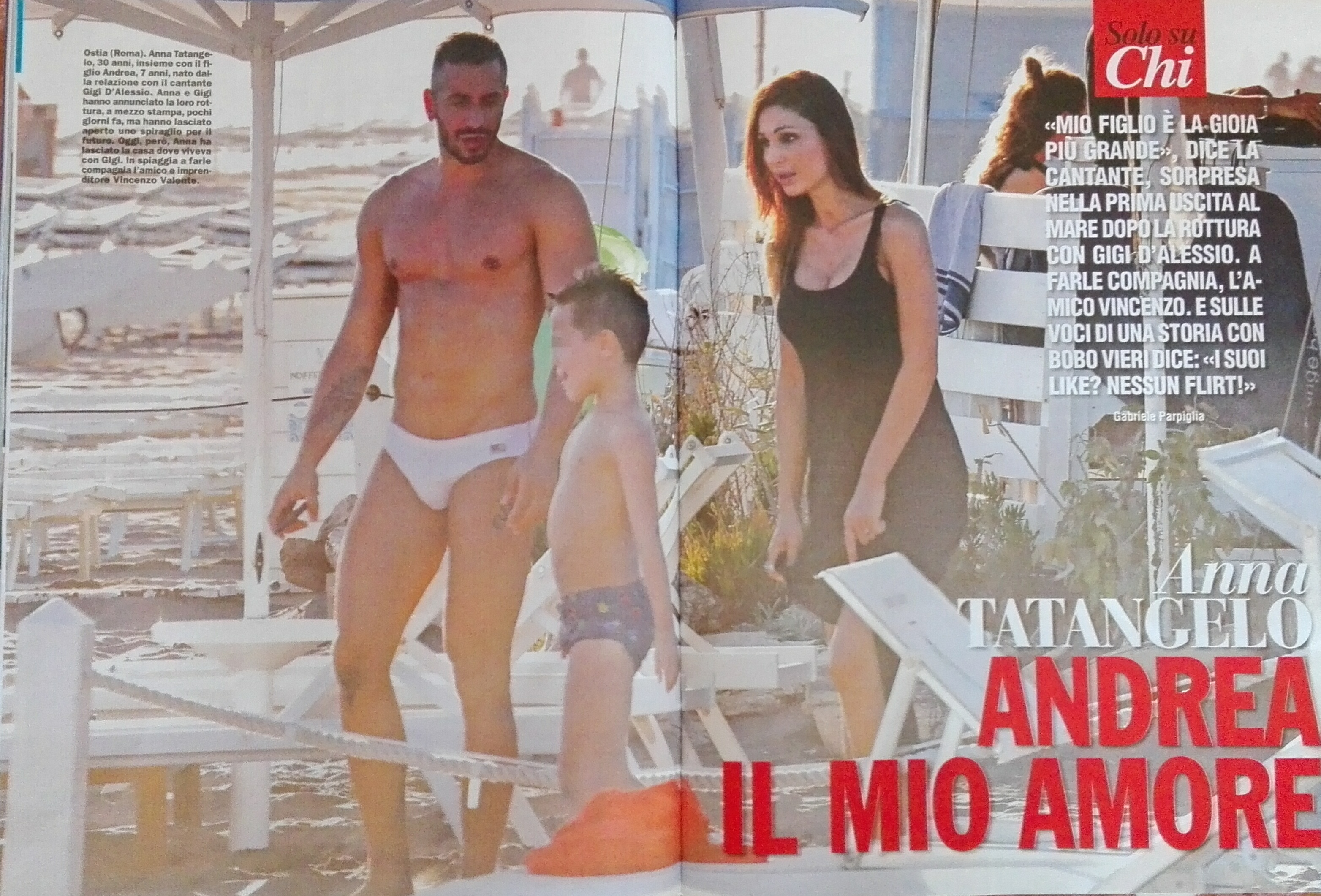 OSTIA – Anna Tatangelo al mare con il figlio e un misterioso amico. Il settimanale Chi ha pubblicato alcune foto che mostrano la cantante mentre si concede un po’ di relax a Ostia, vicino Roma. Insieme a lei solo il suo grande amore, Andrea, figlio nato dalla relazione con Gigi D’Alessio e un uomo che non passa inosservato per la sua bellezza. La rivista lo identifica come Vincenzo Valente, un amico imprenditore.
