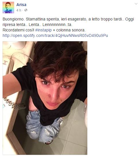 ROMA – Arisa, selfie sul wc: fan deridono la cantante. Uno scatto in diretta dal bagno, in cui è visibile perfino la carta igienica. Forse la valletta di Carlo Conti all’ultimo Sanremo voleva stupire i suoi follower, ma la foto non è stata proprio di buon gusto. Non solo perché si vedevano i pantaloni calati, ma per il messaggio che l’accompagnava, che lasciava intendere che Arisa avesse avuto un attacco di diarrea. “Buongiorno. Stamattina spenta, ieri esagerato, a letto troppo tardi.. Oggi ripresa lenta.. Lenta.. Lennnnnnnn..ta. Ricordatemi così”, ha scritto.