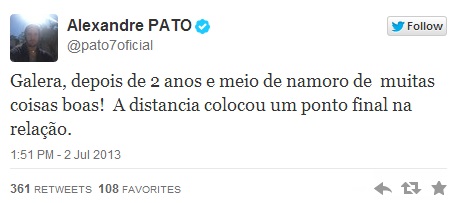 E invece oggi Alexandre Pato ha annunciato sul social network Twitter la fine della sua relazione con Barbara Berlusconi: “Ragazzi, dopo due anni e mezzo di amore e molte cose belle, la distanza ha messo un punto finale alla relazione”, ha scritto l’attaccante del Corinthians.