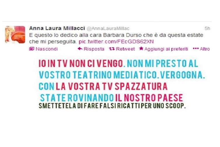 Anche Anna Laura Millacci, ex di Massimo Di Cataldo, ha detto la sua in merito alla presentatrice mediaset. Su Twitter ha quasi denunciato una persecuzione da parte dello staff di Barbara D’Urso “Questo lo dedico alla cara Barbara D’Urso che è da questa estate che mi perseguita (…)”. Il commento è stato postato insieme a una foto con su scritto: “Io in tv non ci vengo, non mi presto al vostro teatrino mediatico, vergogna. Con la vostra tv spazzatura state rovinando il nostro paese, smettetela di fare falsi ricatti per uno scoop”.