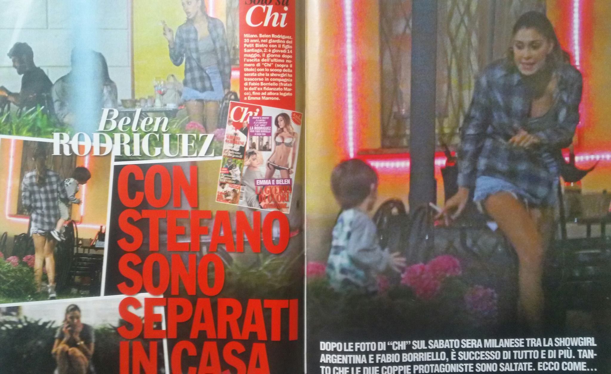 “(…) Poche sere dopo, “Chi” ha assistito alla scena che illustra la rottura con Belen. Siamo al party del ristorante Petit, di proprietà dell’amica e socia di Belen, Simona (loro due, con Joe Bastianich, stanno aprendo il Ricci). Stefano arriva alle 20.30 in moto e dà un’occhiata. Di Belen nemmeno l’ombra. “Dov’è?”, gli domanda un nostro fotografo. “Arriva”, ma io vado. Torno dopo”, risponde lui. Mezzo’ora dopo si palesa Belen. Nervosa. Chiede di non essere fotografata. Concede un solo scatto con Simona. Alle 23 un van nero preleva il gruppo. Stefano non è mai tornato.