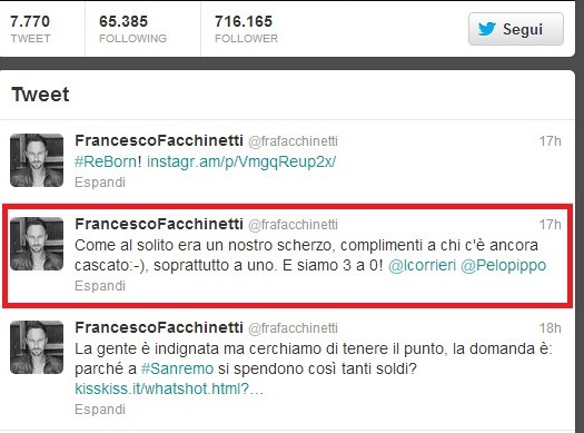 Ma è stato poi Francesco Facchinetti a svelare la messinscena, e su Twitter ha scritto: “Come al solito era un nostro scherzo, complimenti a chi c’è ancora cascato =) soprattutto a uno”.
