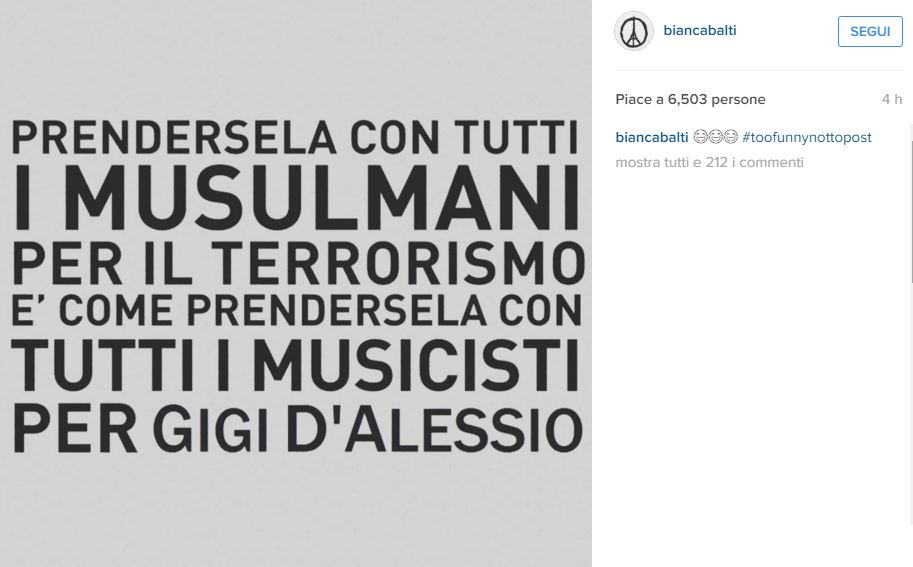 ROMA – Bianca Balti ha pubblicato una foto sul suo profilo Instagram che allude indirettamente alle stragi di Parigi. Si tratta di un post in cui campeggia la frase: “Prendersela con tutti i musulmani per il terrorismo è come prendersela con tutti i musicisti per Gigi D’Alessio“. Una scritta che forse voleva essere ironica, ma che risulta decisamente inadeguata considerando il fatto che lei è un personaggio pubblico. In realtà, la foto è iniziata a circolare sui social, ma ciò non giustifica la scelta di amplificarne la diffusione. “Troppo divertente”, commenta la super modella, che questa volta non sembra aver fatto la scelta giusta condividendo tale post.