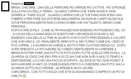 “Briga, che dire…una delle persone più orride più cattive, più stron** sulla faccia della terra, quando capirai che ‘fare musica’ non significa ‘fare soldi’, quando capirai che le tue fans non sono una fabbrica per fare soldi forse migliorerai, ma non in campo musicale dove personalmente non ci sono dubbi che hai talento, bensì come persona… Dopo 8 ore di fila, come altri ragazzi non essendo in possesso del cd, a causa della mancanza di questo nei vari negozi di musica, ed essendo una delle ultime in quanto avevo dato precedenza a coloro che avevano il cd, finalmente arrivato il mio turno come dal video si può capire, la guarda mi chiede il motivo per cui fossi senza cd, dopo aver spiegato la situazione gli chiedo gentilmente di chiedere a Briga di poter fare una fottuta foto dopo tutte quelle ore di fila , la guardia gli dice che ero priva di cd ma che non aveva molto tempo a disposizione, lui con una faccia schifata , gli dice di ‘no, non posso’ e mi fa andare avanti, di conseguenza provo a chiedere una foto, ma la guardia sotto suo ordine , mi spinge e mi fa uscire…. Caro Briga, con tutti i soldi che stai guadagnando comprati un po’ di umiltà”.