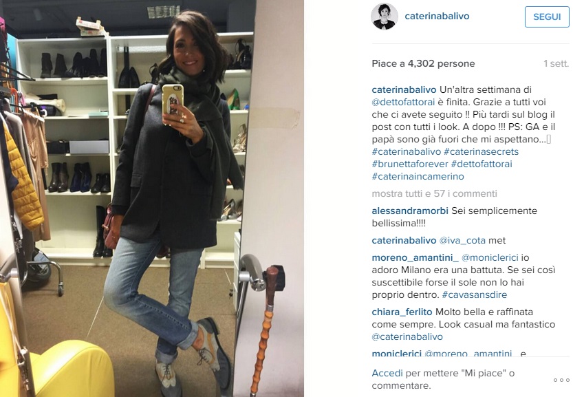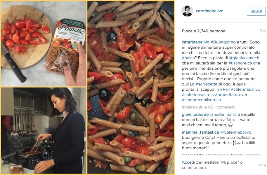“Buongiorno a tutti! Sono in regime alimentare super controllato ma chi l’ha detto che devo rinunciare alla pasta? Ecco la pasta di @gianlucamechche mi aiuterà sia per la #tisanoreica che per un’alimentazione più regolare che non mi faccia dire addio ai gusti più decisi… Proprio come queste pennette qui! La #schiscetta di oggi è quasi pronta, si scappa in #Rai! #caterinabalivo#caterinasecrets #brunettaforever#sempreconilsorriso”.