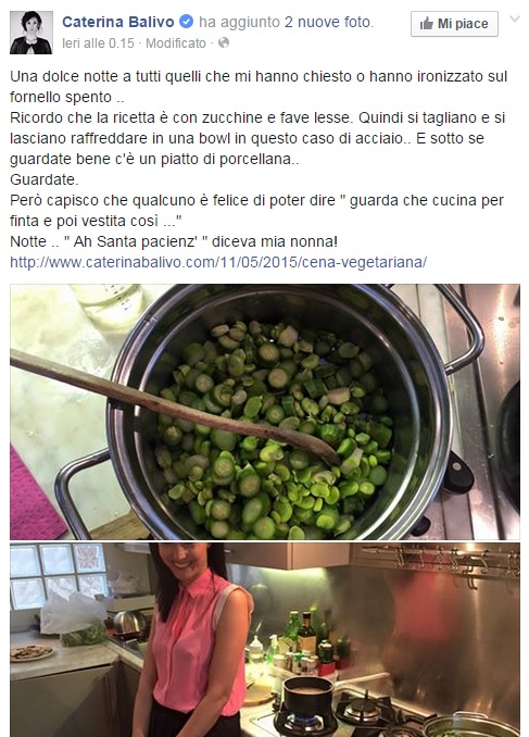 “Una dolce notte a tutti quelli che mi hanno chiesto o hanno ironizzato sul fornello spento… Ricordo che la ricetta è con zucchine e fave lesse. Quindi si tagliano e si lasciano raffreddare in una bowl in questo caso di acciaio.. E sotto se guardate bene c’è un piatto di porcellana… Guardate. Però capisco che qualcuno è felice di poter dire ‘guarda che cucina per finta e poi vestita così’… ‘Ah Santa pacienz’’ diceva mia nonna!”.