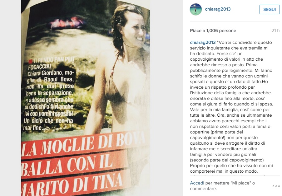 ROMA – Chiara Giordano: “Mi fanno schifo le donne che vanno con uomini sposati”. A due anni dalla separazione di Chiara Giordano con Raoul Bova, l’ex moglie del famoso attore italiano decide di togliersi qualche sassolino dalle scarpe e lo fa sulle sua pagine Facebook e Instagram in occasione del presunto flirt attribuitole dai gossip con Kikò Nalli, marito della nota opinionista di Uomini e Donne Tina Cipollari. La Giordano nelle ultime settimane è stata fotografata in compagnia di Kikò Nalli e da quel momento i gossip si sono sprecati in merito ad una possibile relazione tra i due parlando anche di una “rovina famiglie”. La Giordano però non ci sta e ha deciso di parlare direttamente dalla sua pagina Facebook con un post molto duro e chiaro:
