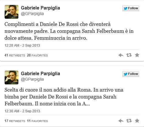 “Il rifiuto di De Rossi al Manchester United è anche una scelta di cuore, in quanto nasconde delle ragioni private. De Rossi, infatti, diventerà padre per la seconda volta visto che la sua compagna, Sarah Felberbaum, è incinta, al quarto mese di gravidanza”.