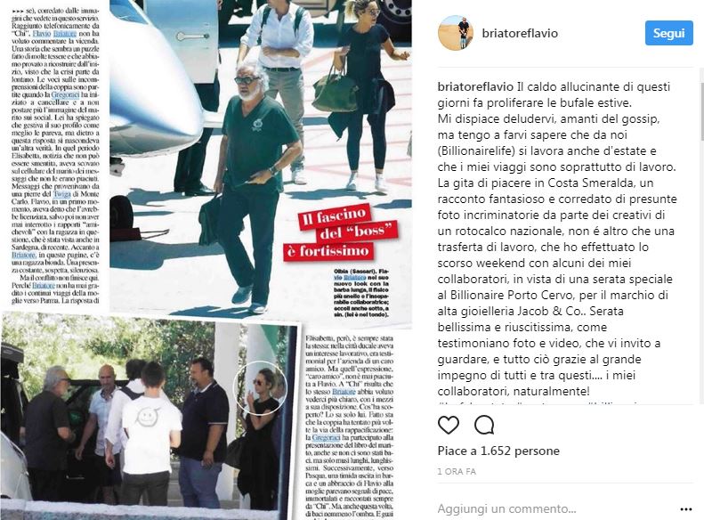 “Il caldo allucinante di questi giorni fa proliferare le bufale estive – scrive Flavio Briatore – Mi dispiace deludervi, amanti del gossip, ma tengo a farvi sapere che da noi (Billionairelife) si lavora anche d’estate e che i miei viaggi sono soprattutto di lavoro.