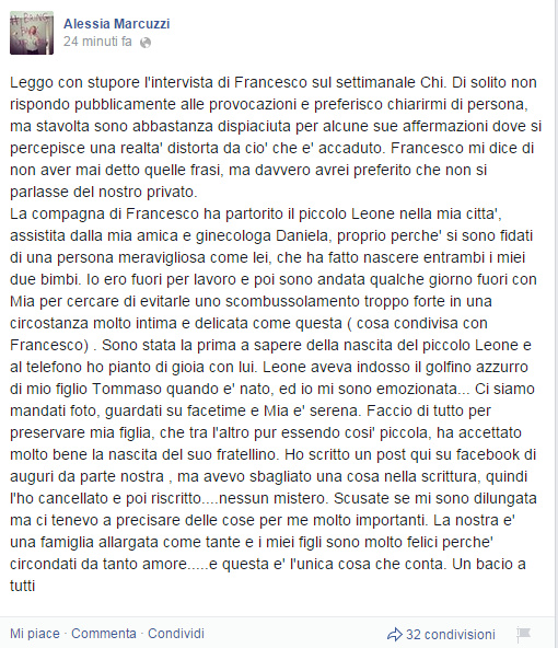 La compagna di Francesco ha partorito il piccolo Leone nella mia città, assistita dalla mia amica e ginecologa Daniela, proprio perché si sono fidati di una persona meravigliosa come lei, che ha fatto nascere entrambi i miei due bimbi. Io ero fuori per lavoro e poi sono andata qualche giorno fuori con Mia per cercare di evitarle uno scombussolamento troppo forte in una circostanza molto intima e delicata come questa ( cosa condivisa con Francesco) . Sono stata la prima a sapere della nascita del piccolo Leone e al telefono ho pianto di gioia con lui. Leone aveva indosso il golfino azzurro di mio figlio Tommaso quando e’ nato, ed io mi sono emozionata… Ci siamo mandati foto, guardati su facetime e Mia e’ serena. Faccio di tutto per preservare mia figlia, che tra l’altro pur essendo cosi’ piccola, ha accettato molto bene la nascita del suo fratellino. Ho scritto un post qui su facebook di auguri da parte nostra , ma avevo sbagliato una cosa nella scrittura, quindi l’ho cancellato e poi riscritto….nessun mistero. Scusate se mi sono dilungata ma ci tenevo a precisare delle cose per me molto importanti. La nostra e’ una famiglia allargata come tante e i miei figli sono molto felici perche’ circondati da tanto amore…..e questa e’ l’unica cosa che conta. Un bacio a tutti”