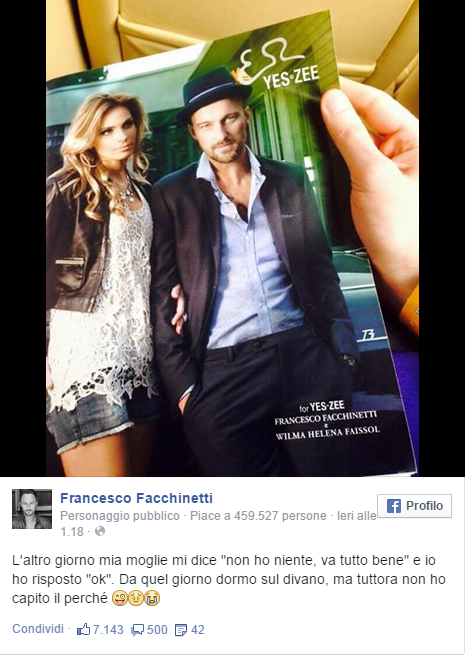 ROMA – E’ già crisi tra Francesco Facchinetti e la moglie Wilma Helena Faissol? A ventilare la crisi è lo stesso Facchinetti che sul suo profilo Facebook ha scritto: “L’altro giorno mia moglie mi dice non ho niente, va tutto bene. Io ho risposto ok. Da quel giorno dormo sul divano, ma tuttora non ho capito il perché”. Seguono faccine.