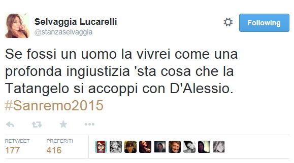 “Se fossi un uomo la vivrei come una profonda ingiustizia ‘sta cosa che la Tatangelo si accoppi con D’Alessio. #Sanremo2015″.
