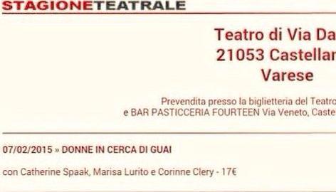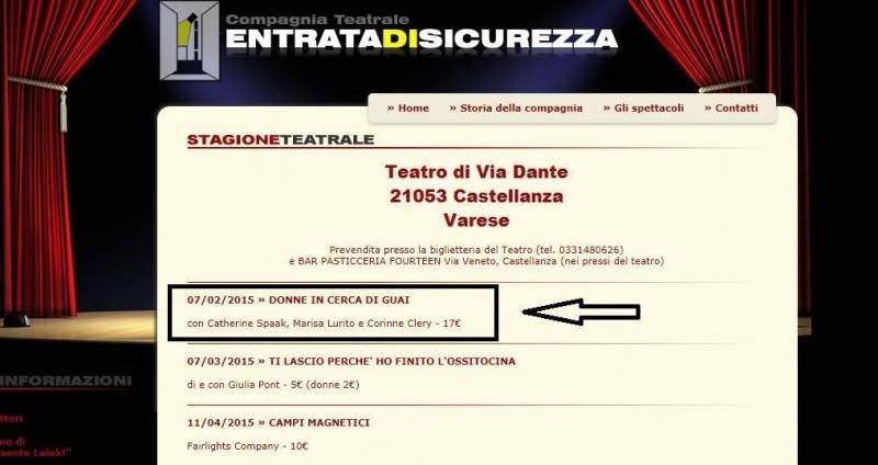 AGGIORNAMENTO: A seguito della notizia trapelata secondo cui la Spaak avrebbe partecipato alla commedia “Donne in cerca di guai” in cartellone il 7 febbraio a Castellanza (Varese), il sito del teatro ha cambiato programmazione e ora è visibile solo la scritta “07/02/2015 » (DA DEFINIRE) …”, come è possibile vedere nella foto in gallery. Ci chiediamo se il repentino cambio non sia dovuto proprio al “mistero” della fuga della Spaak dall’isola… in realtà come si legge sul sito di Davide Maggio: “In realtà veniamo a sapere che la ‘dama in bianco’ era stata sostituita da Iva Zanicchi nei mesi scorsi proprio per consentirle la partecipazione all’Isola”. Non ci resta che attendere aggiornamenti…