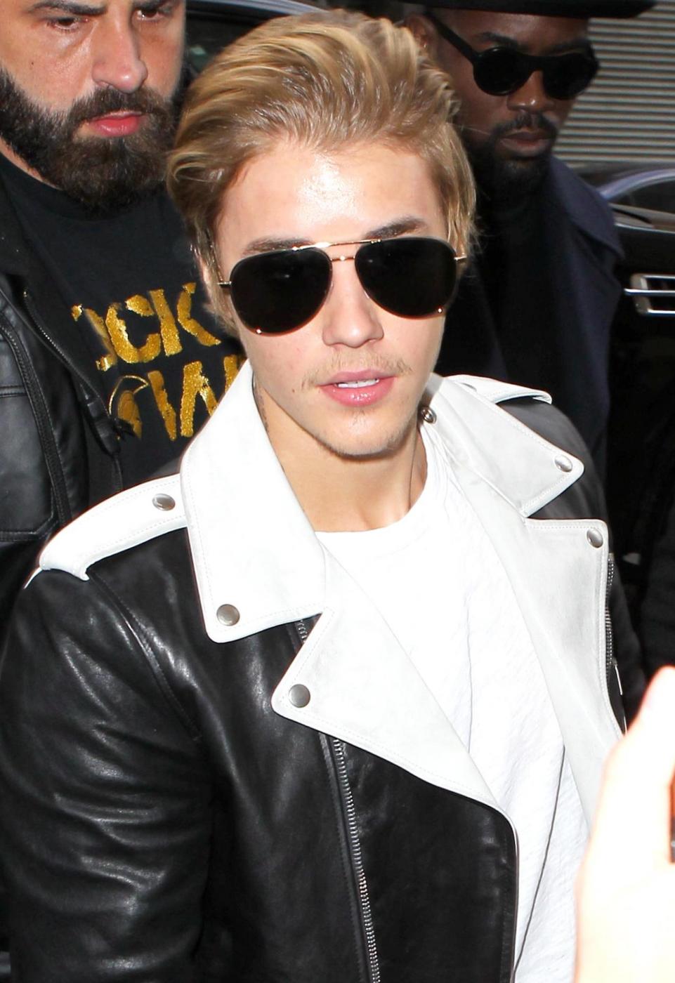 Justin Bieber alla sfilata di Kanye WestJustin Bieber was looking quite stylish for Kanye West's fashion show in New York City. The pop star was wearing aviator shades and a black and white leather jacket. X17online.com LaPresse -- Only Italy