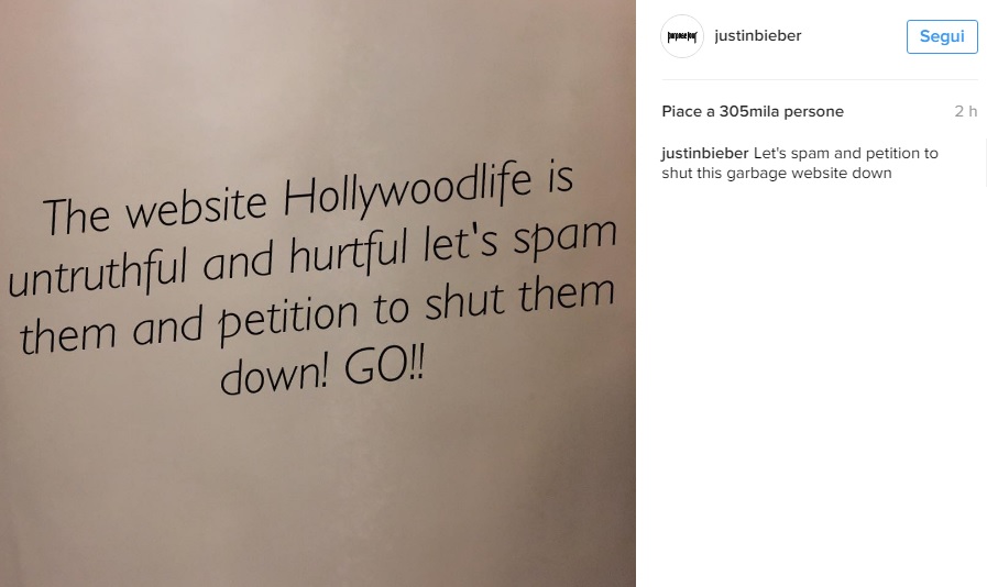 Justin Bieber furioso: chiede chiusura sito di gossip americano HollywoodLife. Si sa che il cantante non è mai andato d’accordo con i media che prendono di mira la sua vita privata. In questo caso l’artista canadese non specifica il motivo del suo astio, ma non è impossibile fare delle ipotesi. Uno degli ultimi articoli che parla di lui è relativo a un presunto flirt tra Justin e Nicola Anne Peltz, un’attrice statunitense di 21 anni. Il sito allude ad una “sbandata” della star per la bella Nicole. Tra l’altro, il pezzo pubblicato in rete non è più disponibile e se ne può vedere l’anteprima solo sulla home page di HollywoodLife. Forse Bieber ha già agito per vie legali? In questi ultimi giorni il nervosismo di Justin deve essere alle stelle, considerando che il video della sua rissa fuori da un locale di Cleveland ha fatto il giro del mondo dopo che Tmz ha caricato il video sul suo canale Youtube.