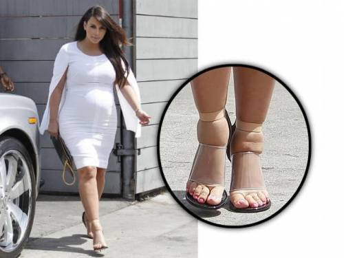 Kim Kardashian... (clicca sulla foto per continuare a leggere) Kim Kardashian con piedi visibilmente gonfi stretti dentro delle scarpe con fascia in plastica