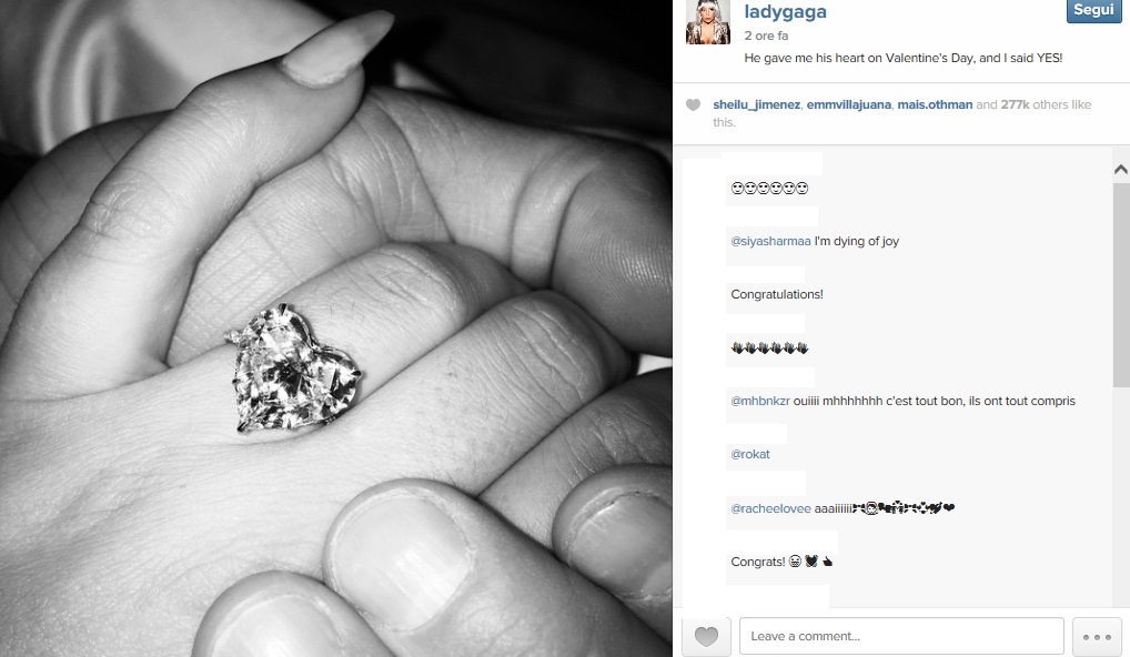 ROMA – Lady Gaga si sposa, matrimonio con Taylor Kinney: annuncio su Instagram. A quanto pare per Lady Gaga questo san Valentino è stato davvero speciale: Taylor Kinney le ha chiesto la mano! A dare la notizia è la stessa Lady Gaga sul suo profilo Instagram. La cantante ha pubblicato una foto in cui mostra un enorme anello di diamanti a forma di cuori con cui il fidanzato le ha fatto la proposta di matrimonio. E la didascalia con cui Lady Gaga ha accompagnato la foto questa volta non lascia spazio a dubbi:“Mi ha dato il suo cuore a San Valentino, e io ho detto sì!”.