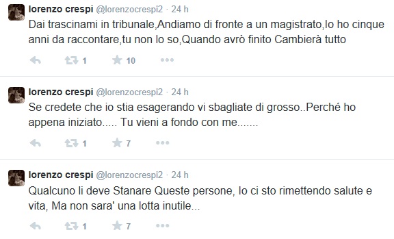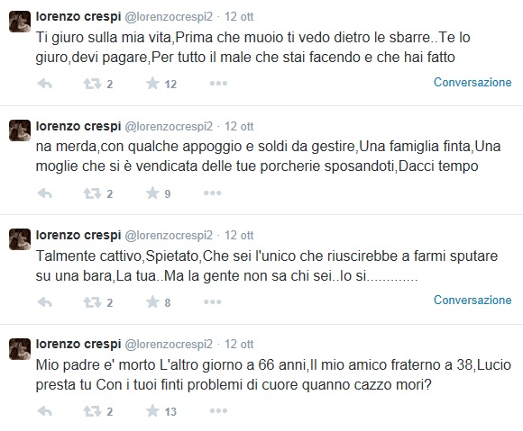 Questo è solo il primo dei commenti al vetriolo lasciati da Lorenzo Crespi, in cui l’attore fa esplicito riferimento a Lucio Presta, ma non è l’unico tweet decisamente violento che ha lasciato sul suo account Twitter. Dopo pochi minuti, Lorenzo Crespi ha continuato: