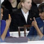 U.S. first lady Michelle Obama, center, hugs her daughters Malia, left, and Sasha, right, when they watch a performance during their visit to an ancient city wall in Xi'an, in northwestern China's Shaanxi province, Monday, March 24, 2014. (AP Photo/Alexander F. Yuan)