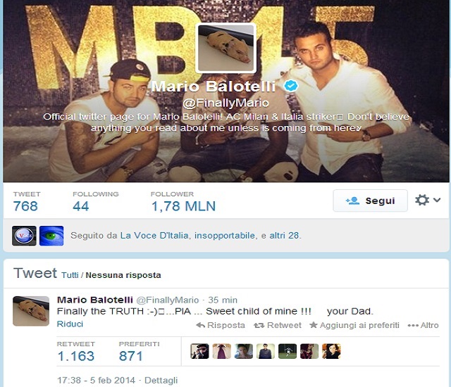 Nei giorni scorsi era trapelato il gossip secondo cui Mario Balotelli si sarebbe sottoposto al test del Dna. Secondo il rumors i risultati sarebbero arrivati a Maggio ma sembra che Mario sappia già la verità… tanto da dichiarare su Twitter di essere lui il padre di Pia.