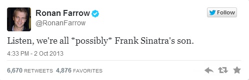 Ronan Farrow è nato nel 1987, il che vorrebbe dire che Frank Sinatra aveva più di 70 anni quando avrebbe generato il 25enne avvocato. Il presunto figlio ha commentato la rivelazione di sua madre su Twitter: “Sentite, siamo tutti presunti figli di Frank Sinatra.”
