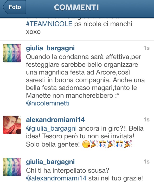 Non mancano ovviamente i sostenitori di Nicole, come “Alexandromiami14” che risponde al messaggio di “giulia_bargagni”: “Bella idea! Tesoro però tu non sei invitata, solo bella gentee”. Oppure “alex92pal” che dimostra a Nicole la sua solidarietà: “Dove sei?? Ci manchi tantissimo! NOn ti scoraggiare ti difenderemo sempre!!”