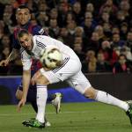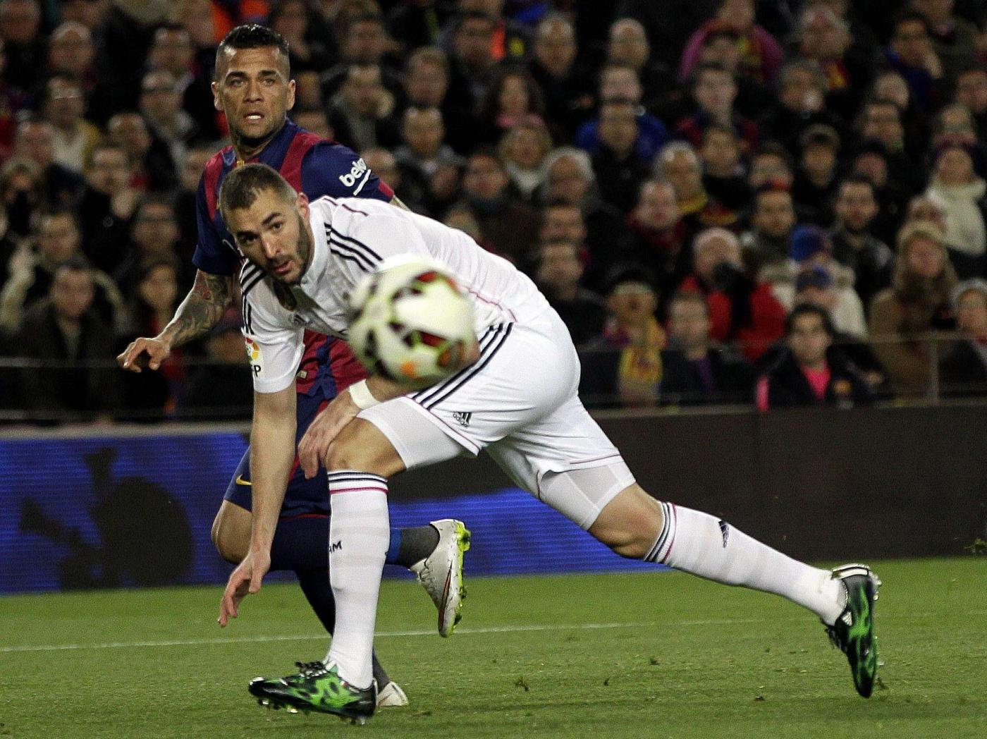 Real Madrid's French striker Karim Benzema (front) duels for the ball with FC Barcelona's Brazilian defender Dani Alves (back) during the Spanish Liga Primera Division soccer match played at Camp Nou stadium, in Barcelona, Spain, 22 March 2015. EFE/Alberto Estevez