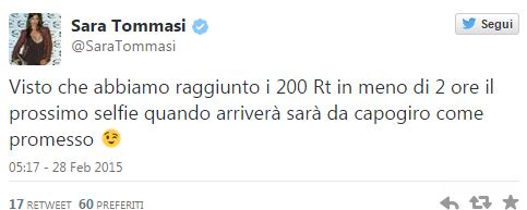 Il selfie ha uno scopo ben preciso, ovvero quello di raggiungere i 200 retweet nel giro di due ore, obiettivo raggiunto, anzi superato. (PER VEDERE LE FOTO SCORRI IN BASSO).
