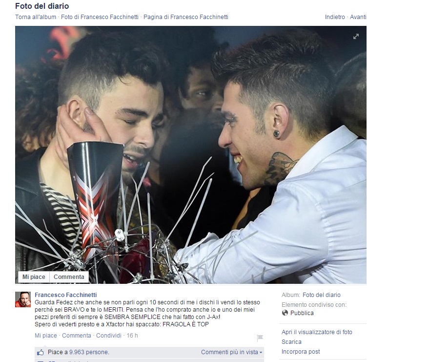 “Guarda Fedez che anche se non parli ogni 10 secondi di me i dischi li vendi lo stesso perché sei BRAVO e te lo MERITI. Pensa che l’ho comprato anche io e uno dei miei pezzi preferiti di sempre è SEMBRA SEMPLICE che hai fatto con J-Ax! Spero di vederti presto e a Xfactor hai spaccato: FRAGOLA È TOP”