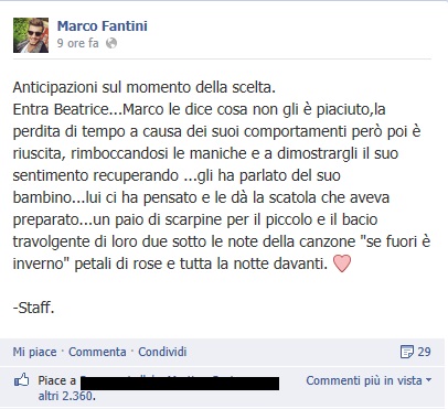“La scelta di Marco è durata tantissimo: Maria gli ha proposto di non chiamare in studio la non-scelta ma lui non ha voluto… a Noemi ha detto tutto, anche se dopo non è riuscito più a parlare… poverina lei, che ha detto che già lo sapeva… lo ha abbracciato ed è uscita subito. A Beatrice Marco ha fatto una sorpresa bellissima: le ha fatto capire che fosse la sua scelta regalandole un paio di scarpe per il suo bambino… Le ha spiegato che ha perso troppo tempo per decidersi e che il bambino all’inizio era un freno: ora, però, non ha più dubbi! Tina ha pianto tanto e alla fine è stata lei a salutare tutti! Davvero un bel momento!”
