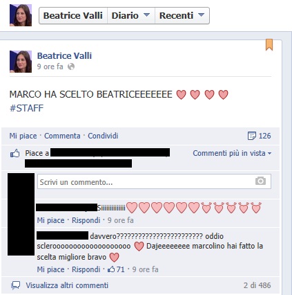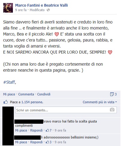 “Finalmente Marco ha scelto Beatrice! Augurissimi alla nuova coppia, la coppia migliore! Oggi, 29 marzo 2014 una nuova favola ha inizio! “.